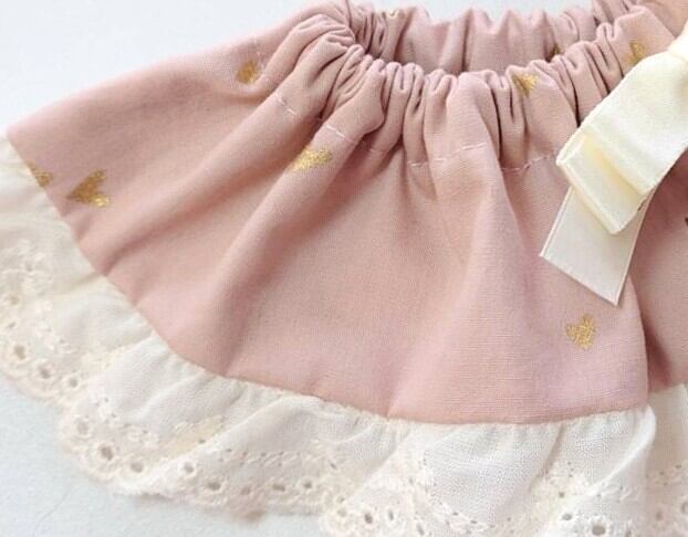 キラキラゴールドラメのハートプリントが可愛い優しいピンク地にアイボリーレースを付けてガーリーに。