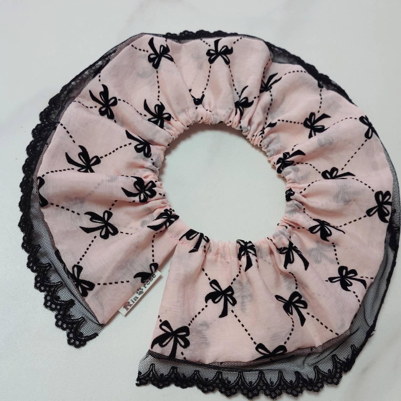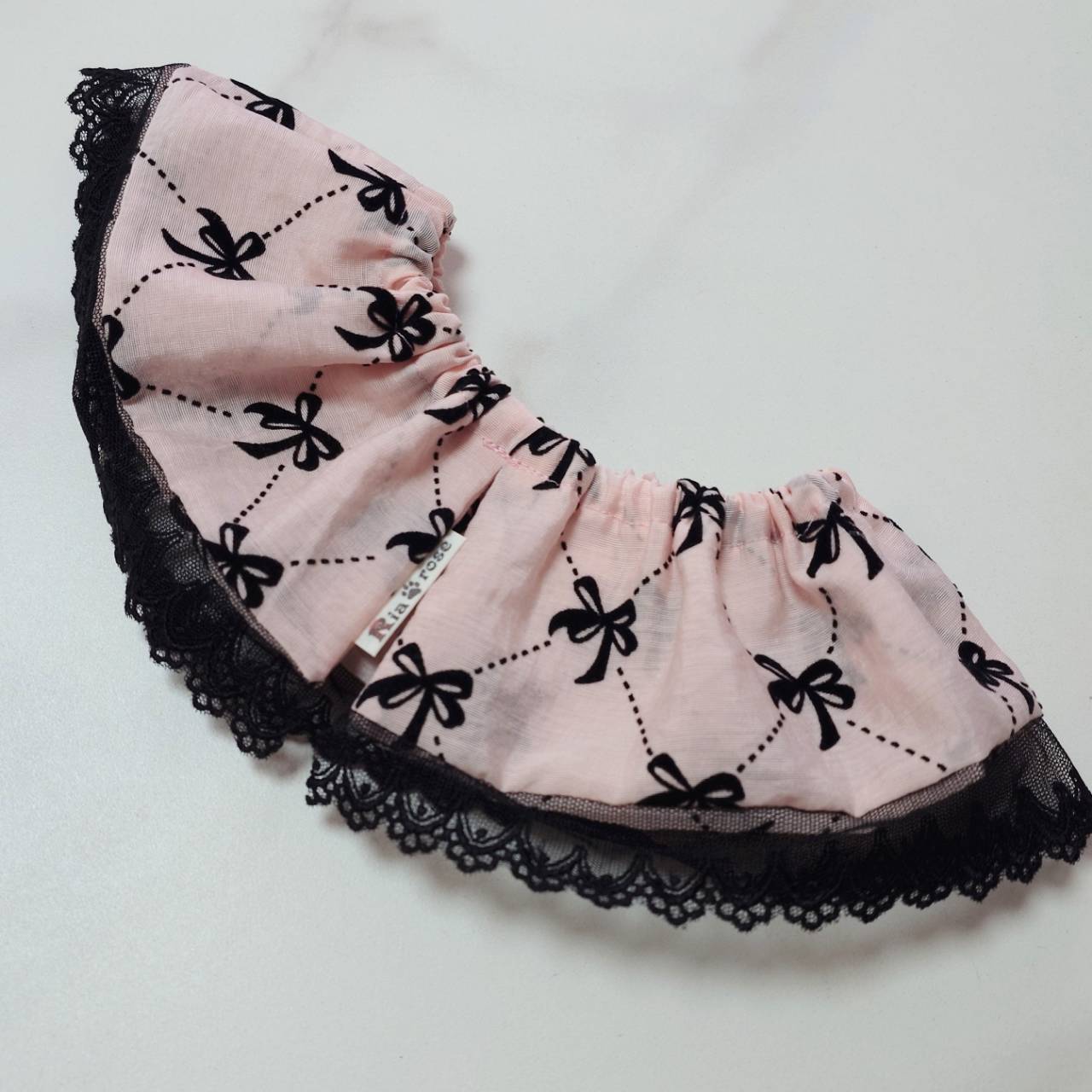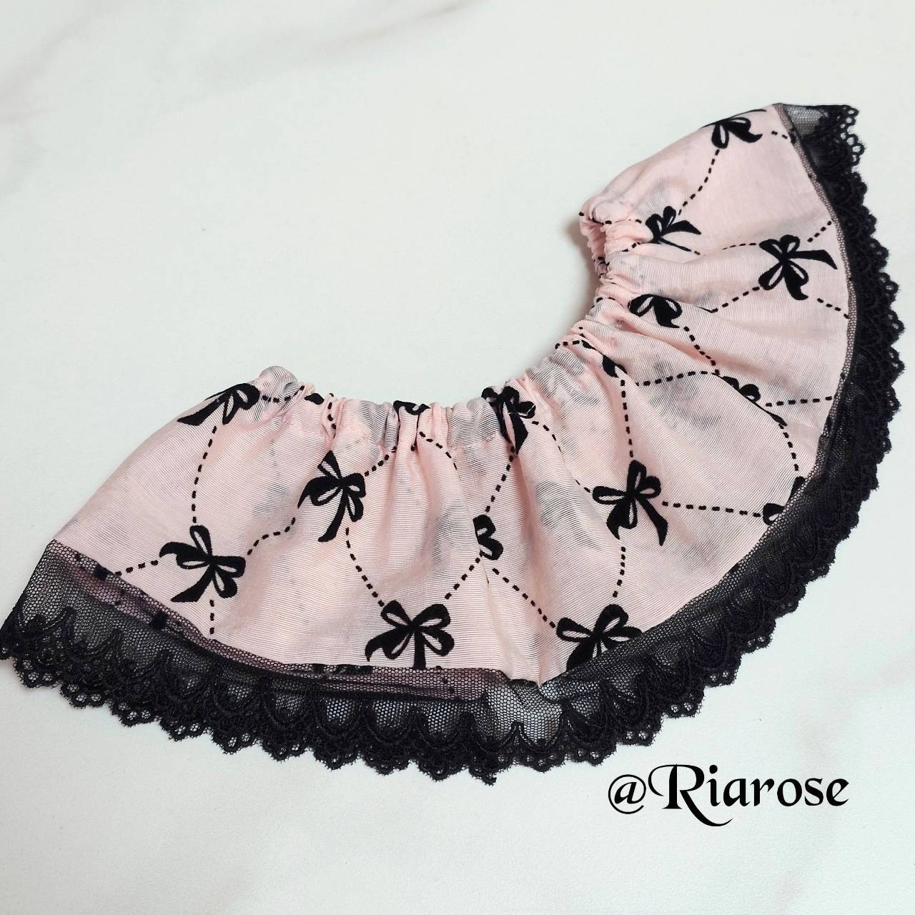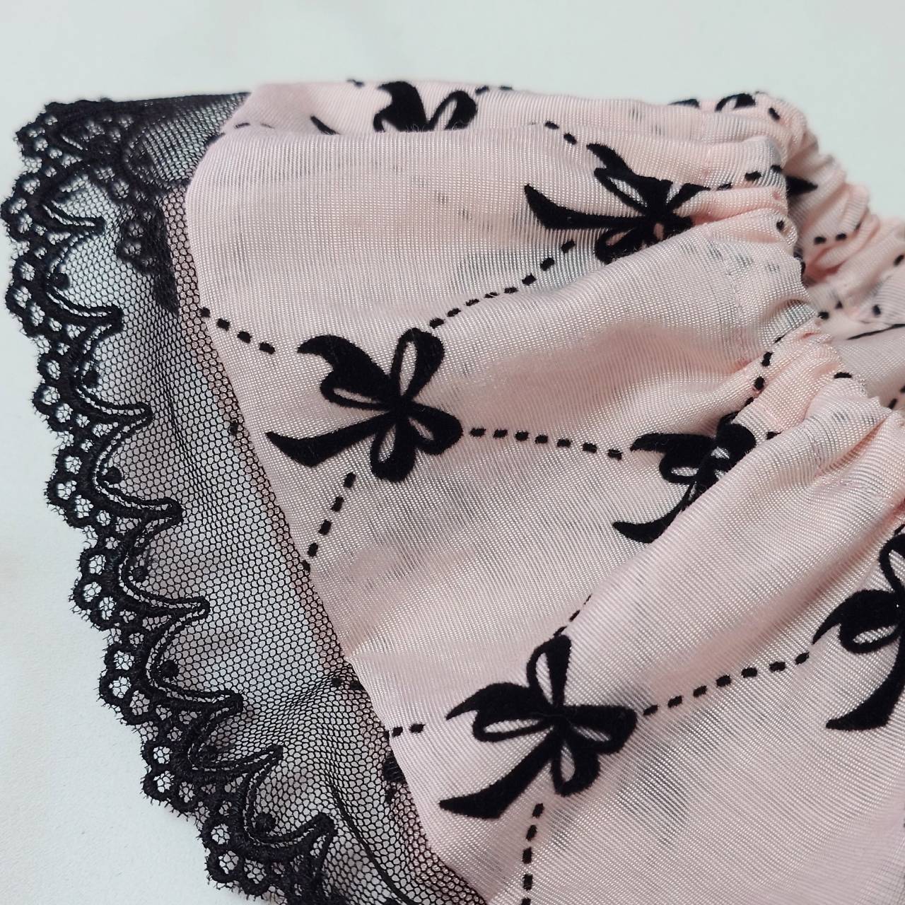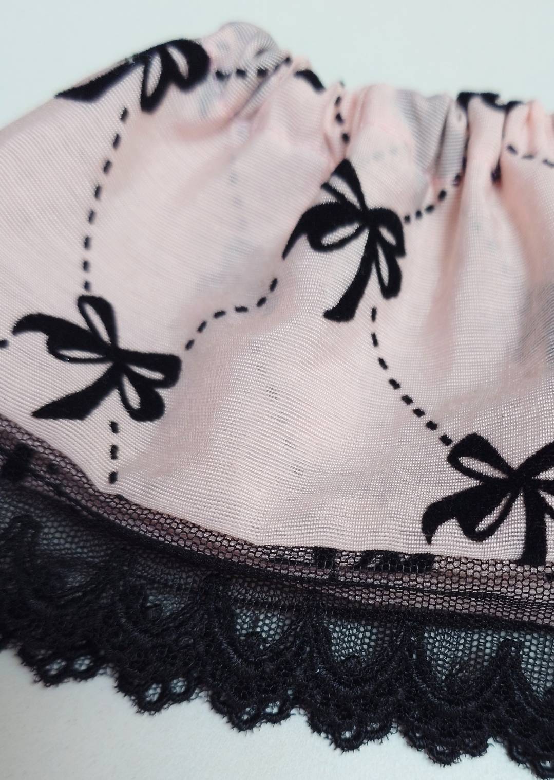 ピンクのシースルーリボンレースの裾に黒のチュールレースを飾り付けた可愛いまんまるスタイです。