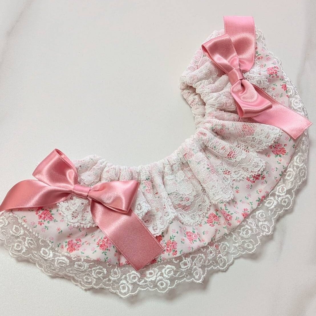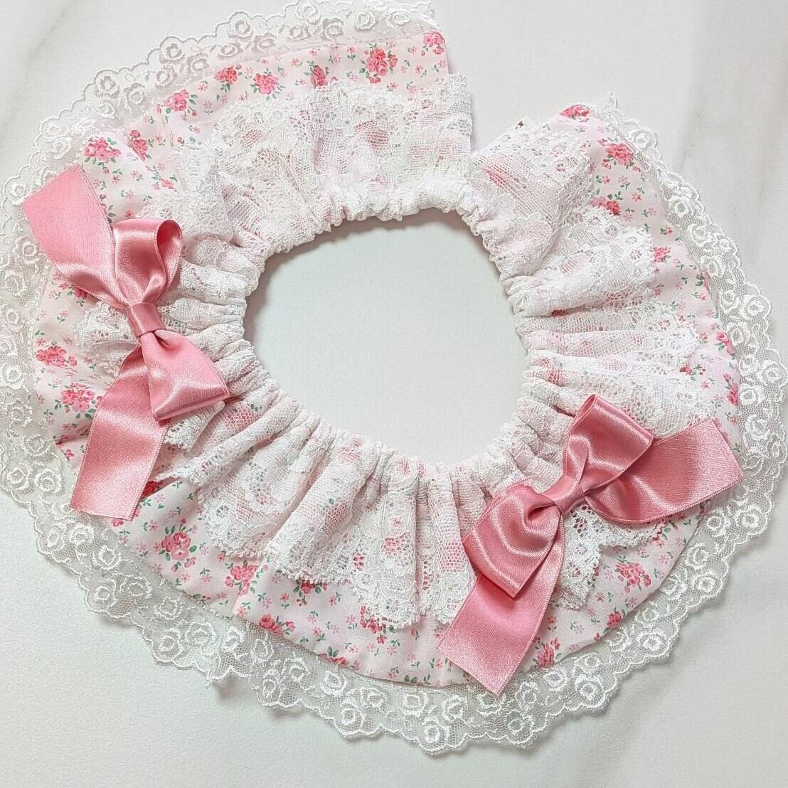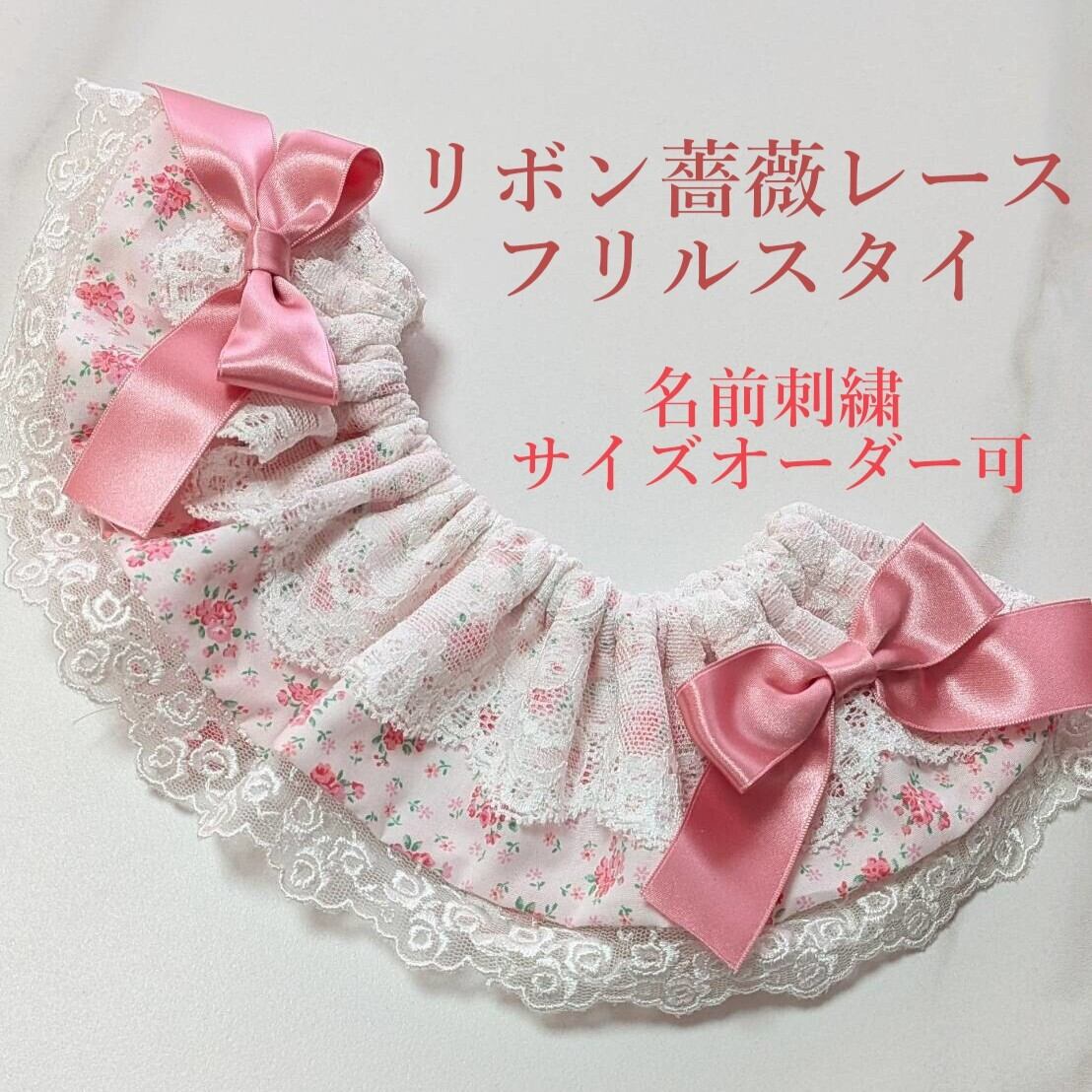 ピンクWリボン薔薇レースフリルスタイ お名前刺繍可能 サイズオーダーメイド ワンちゃんペット用付け襟ビブ 首飾り ハンドメイド 可愛いフリフリ