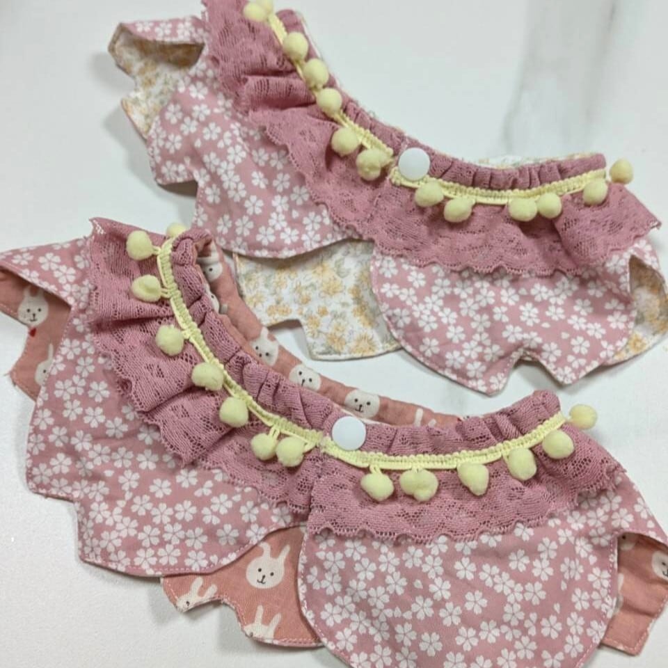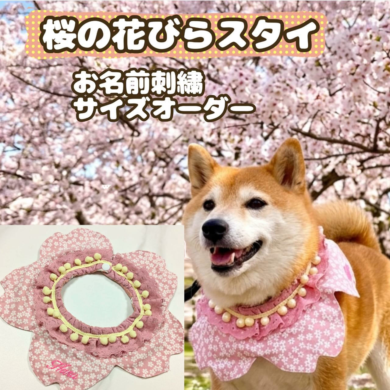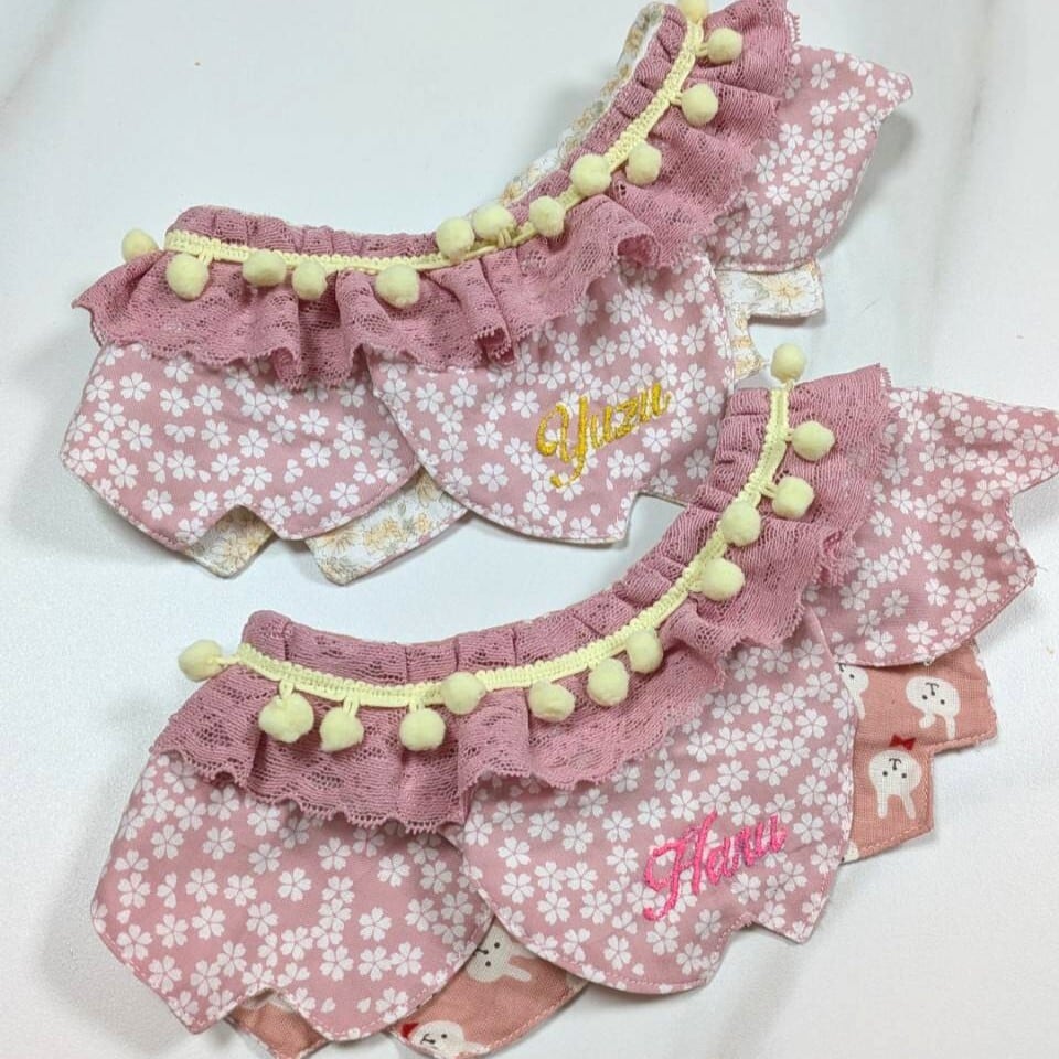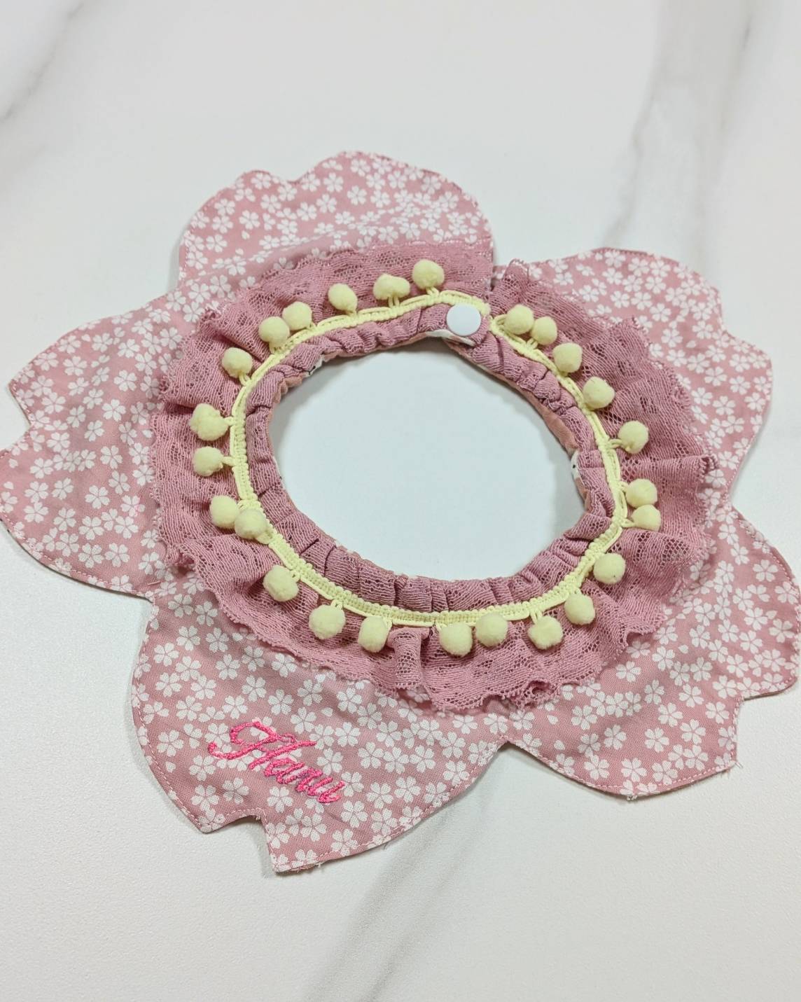 桜の花びらスタイ ペット付け襟 わんこのおしゃれアイテム 可愛いピンクフラワー ボンボンレース セミオーダー サイズオーダー お名前刺繍可能